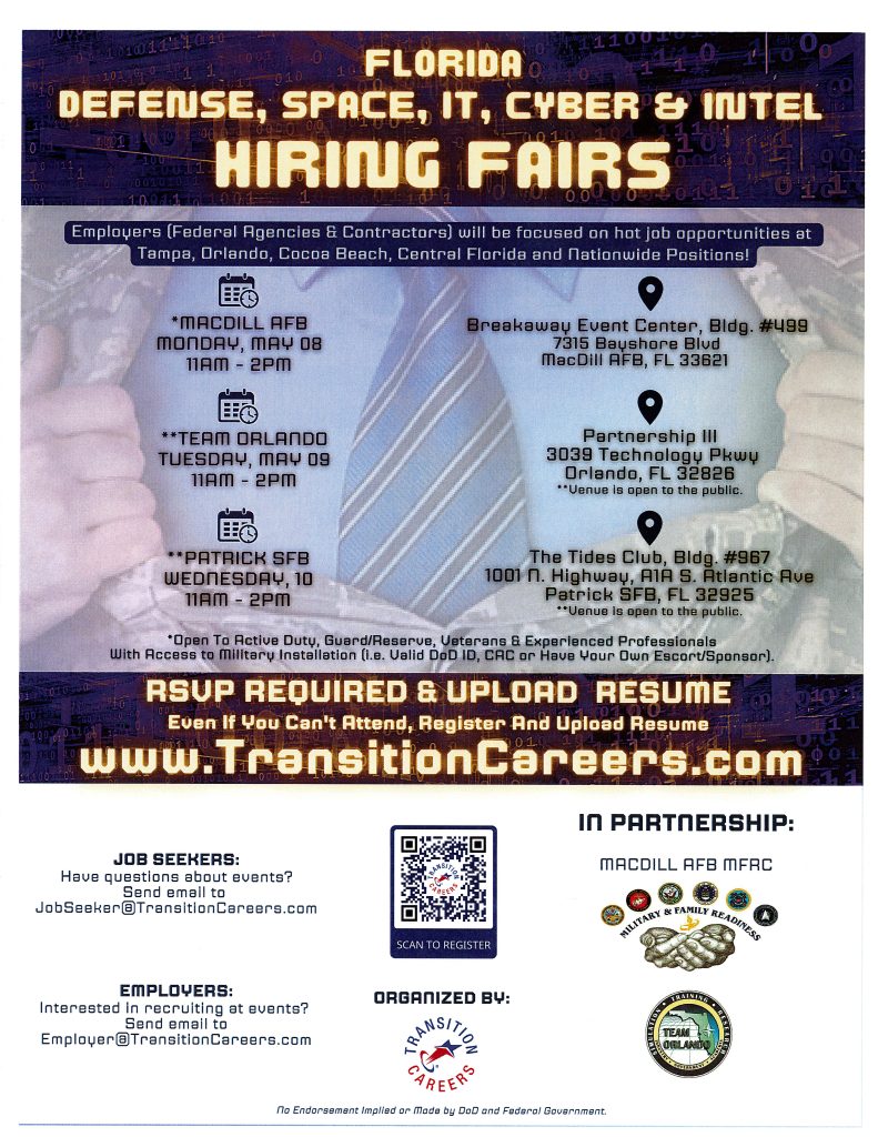Employers (Federal Agencies and Contractors) will be focused on hot job opportunities at Tampa, Orlando, Cocoa Beach, Central Florida and nationwide positions.